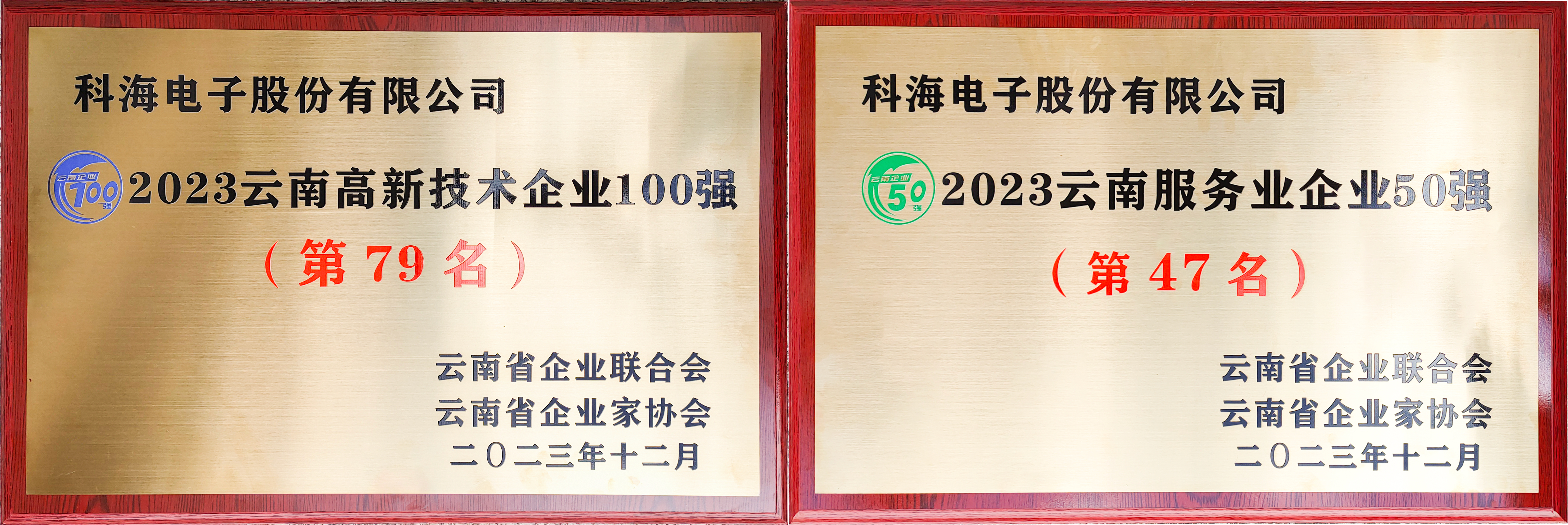 12月16日,由云南省企業聯合會、云南省企業家協會聯合舉辦的“2023云南企業100強發布會”在昆明市隆重舉行,會議對云南優秀企業進行了榮譽表彰。科海電子榮登“2023云南高新技術企業100強”、“2023年云南服務業企業50強”榜單。